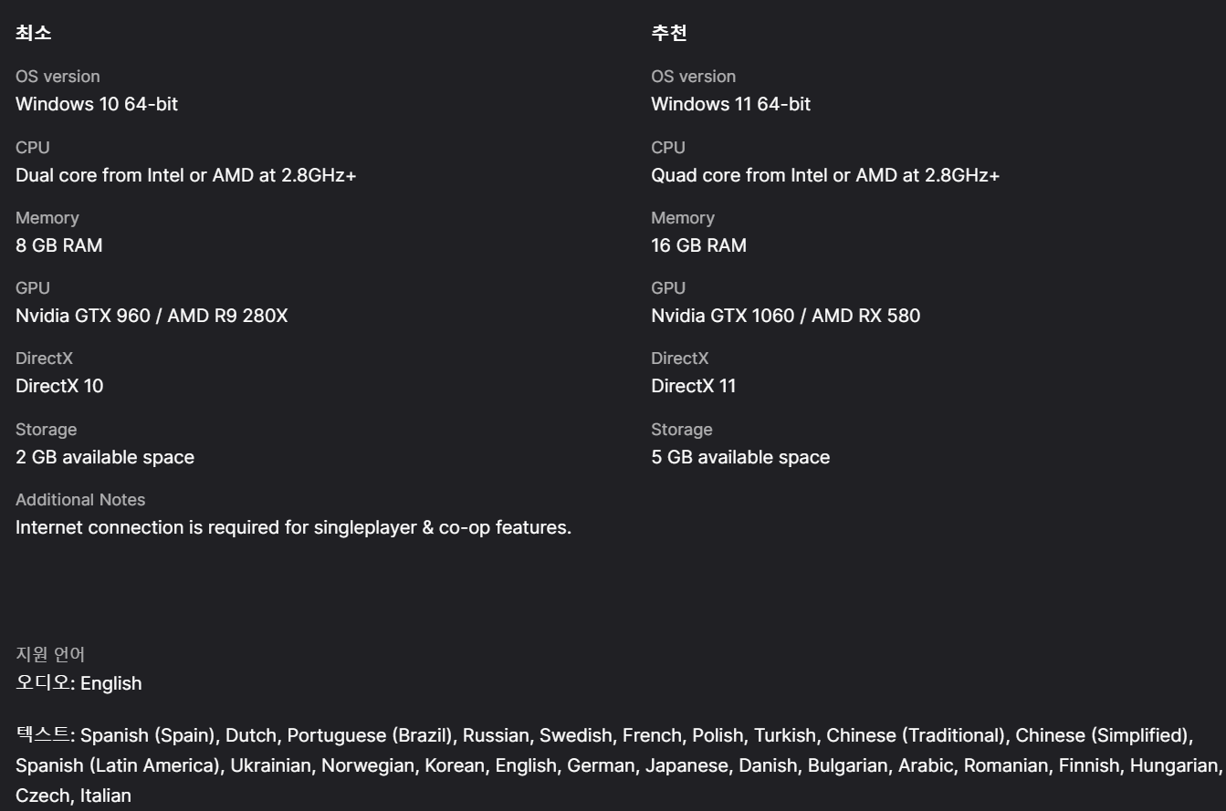 권장: Windows 10 (64-bit), Intel Core i5 3.0 GHz 또는 AMD 동급, 8GB RAM, DirectX 11 호환 GPU, 2GB 설치 공간