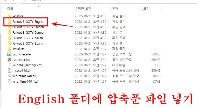 탐색기 폴더가 열리면 'Fallout3 GOTY English' 폴더에 압축을 푼 파일을 넣어 줍니다.