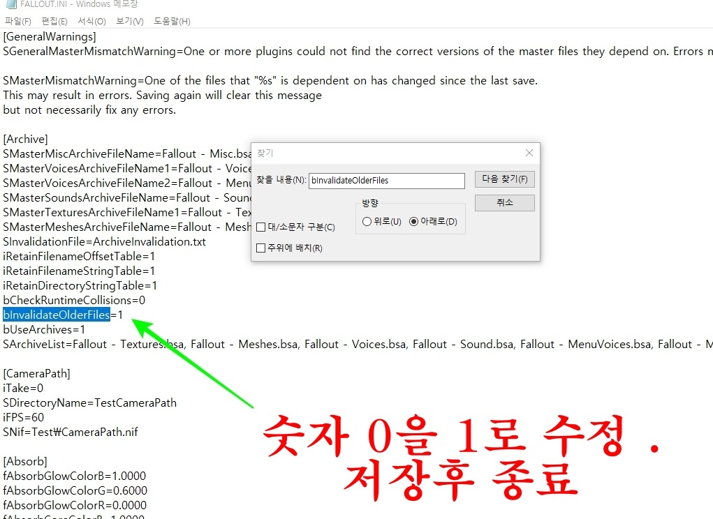 5) 컨트롤 + F 키를 눌러 찾기 창이 뜨면 "blnvalidateOlderFiles"를 찾습니다.  "blnvalidateOlderFiles=0"에서 숫자 '0'을 '1'로 수정합니다.  메모장 저장 후 종료 합니다.